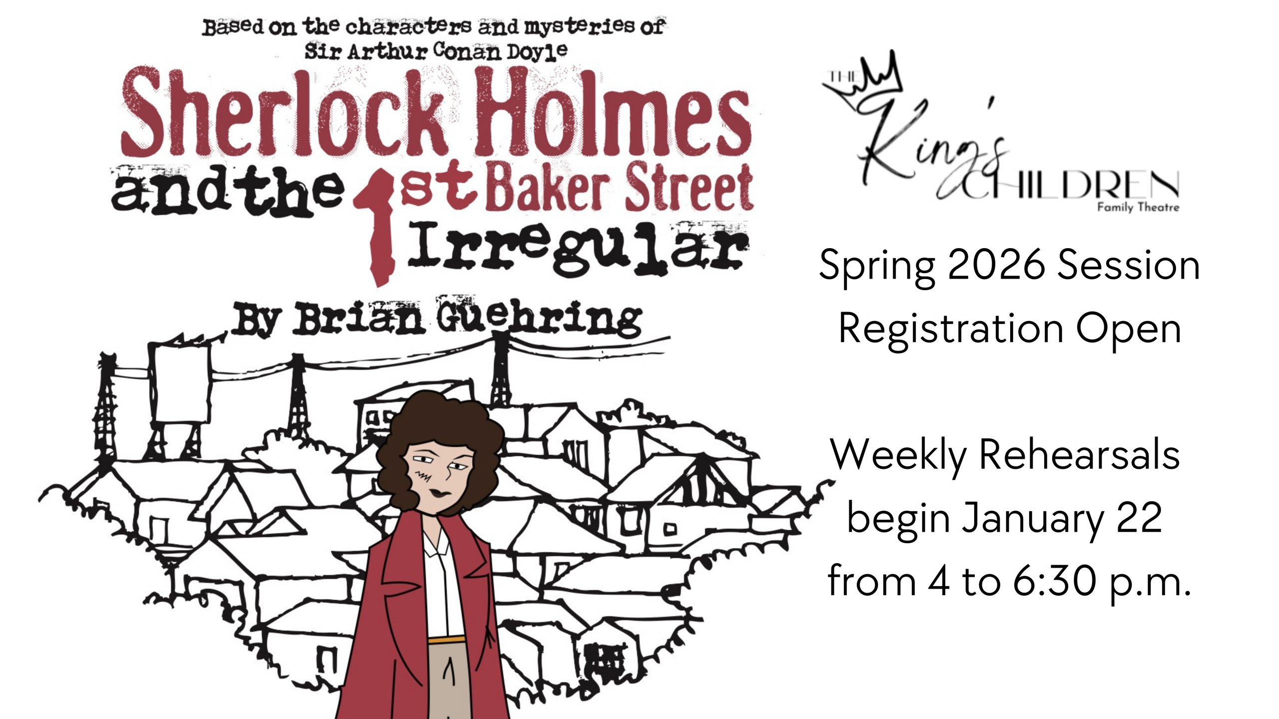 The King’s Children Family Theatre Ministry is producing Sherlock Holmes and the First Baker Street Irregular this spring. Written by Brian Guehring, and produced by special arrangement with the Dramatic Publishing Company, Inc., of Woodstock, Illinois, this delightful play will be sure to enchant and challenge the students!